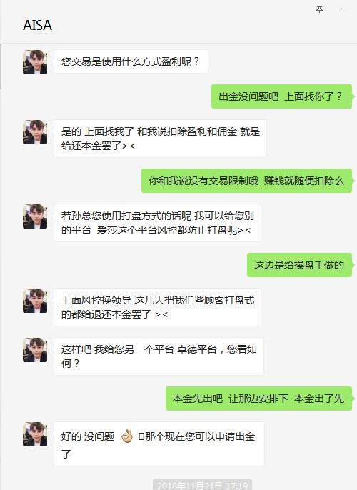 AISA爱莎外汇开户前客户经理确认无任何交易限制,事后盈利却以打盘为由不给任何盈利. 本人在2018.11.14在AISA爱莎外汇开户入金2万美元,手动操作了2张日内趋势单分别都有盈利,然后和姿管合作. 之后把账户交给姿管合作后姿管账面盈利4000美元左右随后提交出金却被AISA爱莎外汇拒绝并且于4天后扣除盈利打回损失汇率差后的本金. 我无法和此赖皮的交易商争论姿管的手法手法违反什么规定,只想把自己操作的两张单子几百美金的盈利拿回却又遭到拒绝. 如图所示,此交易商可直接在后台修改订单数据. 我的说法举例:比如我在一家平台交易了半年,最终产生了300美元盈利.之后交给姿管操作,就算姿管违规操作平台商判断有罪,但是也不该把之前产生的300美元一起扣除. 此举只能说明一点:小平台 纯对赌 输不起.