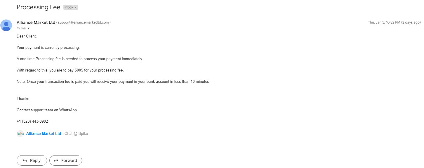 Hello. In December, 2022, I was contacted by a person via a social media (Instagram), who pretends to be a professional Forex trader using the binary options. She said that I have to open an account on the following platform: Alliancemarketltd.com, which I did after her push. She also said, all I have to do is to buy an investment plan which costs $300 and it would be usable during 5 days. I was skeptic at the beginning but after a few days, I said why not and I bought this investment plan. She asked me to give me my e-mail to her so she can put in her software in order to star the trading. After a few days, I have checked my Alliance market account and yes, indeed, the profit appeared on my account. The final profit was exactly $10635. When it comes for the withdrawal, I was asking to pay a fee for $500 called ''withdrawal fee''. This fee is also listed on their website. I paid this amount of money, and I have received the confirmation via e-mail that my withdrawal request of $10635 have approved and funds have been sent to my selected account. After that, I have received another e-mail which said that my withdrawal has been successfully approved and it will reflect in my bank account in 24 hours. After a few hours after this e-mail which confirms that the money will reflect in my bank account, I have received another e-mail where it says that a one time processing fee is needed to process my payment immediately. They were requesting me to pay another $500 and it was said that after this payment, I will receive the amount of $10635 in less than 10 minutes. Well, I did not pay it due to my ''red flag'' because it could be possible to lose another $500 for these scammers. I would appreciate if you can check this broker called ''Alliancemarketltd.com''. Are they scammers indeed or not? I have also contacted their support on Whatsapp and this guys asked to buy this final amount of $500 into a Bitcoin address provided by him. He said that this address is an ''international charges''. If they are scammers indeed, I would like to make sure that they have been exposed. Alliance market ltd or you can access by using: Alliancemarketltd.com.
