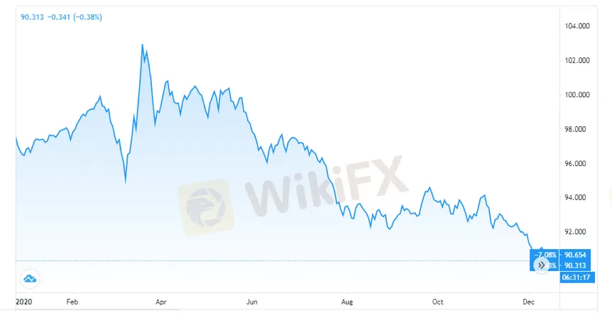 WikiFX News (26 ธ.ค. ) - ในปี 2564 ที่จะมาถึงนี้เนื่องจากคาดว่าการฟื้นตัวของเศรษฐกิจโลกจะเพิ่มขึ้นและธนาคารกลางสหรัฐยังคงดำเนินนโยบายการเงินที่หลวมมาก ดัชนีดอลลาร์สหรัฐคาดว่าจะยังคงมีแนวโน้มลดลงในปี 2564