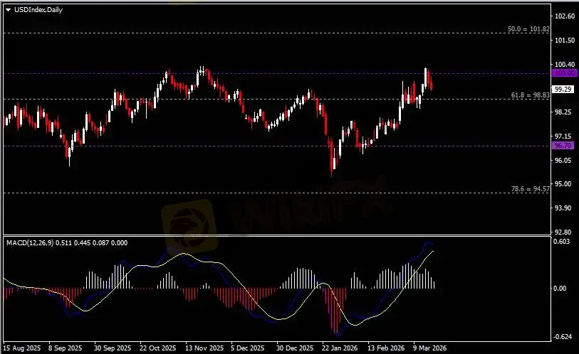 日线图显示美元指数回调走弱,当前承压于100关键阻力。从MACD来看,快慢线呈拐向,白色动能柱温和收缩。指数走势基本和动能柱的变化一致。