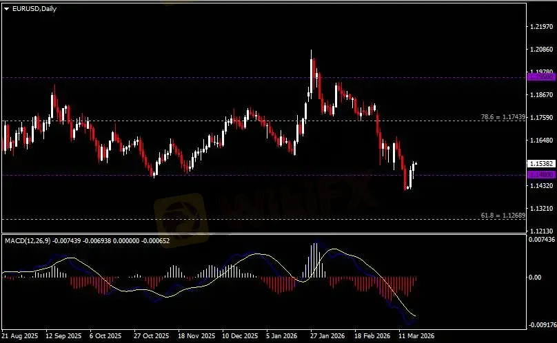 日线图显示欧元兑美元反弹上行,当前收于1.1480支撑。从MACD来看,快慢线呈拐向,红色动能柱温和收缩。汇价走势基本和动能柱的变化一致。