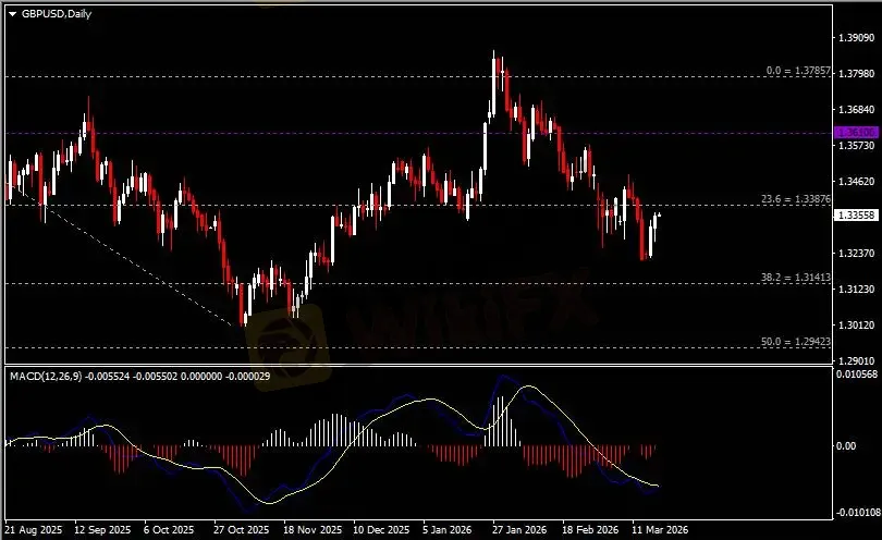 日线图显示英镑兑美元反弹上行,当前仍承压于1.3390阻力。从MACD来看,快慢线欲形成金叉,红色动能柱温和收缩。汇价走势基本和动能柱的变化一致。