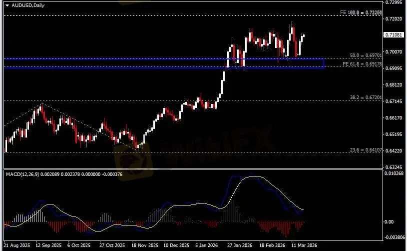 日线图显示澳元兑美元震荡走强,当前收于0.6920-0.6970支撑区域。从MACD来看,快慢线呈拐向,红色动能柱温和收缩。汇价走势基本和动能柱的变化一致。