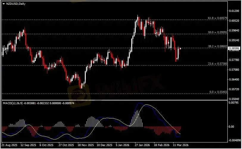 日线图显示纽元兑美元反弹暂缓,当前测试0.5860阻力。从MACD来看,快慢线呈拐向,红色动能柱温和收缩。汇价走势和动能柱的变化呈分歧。