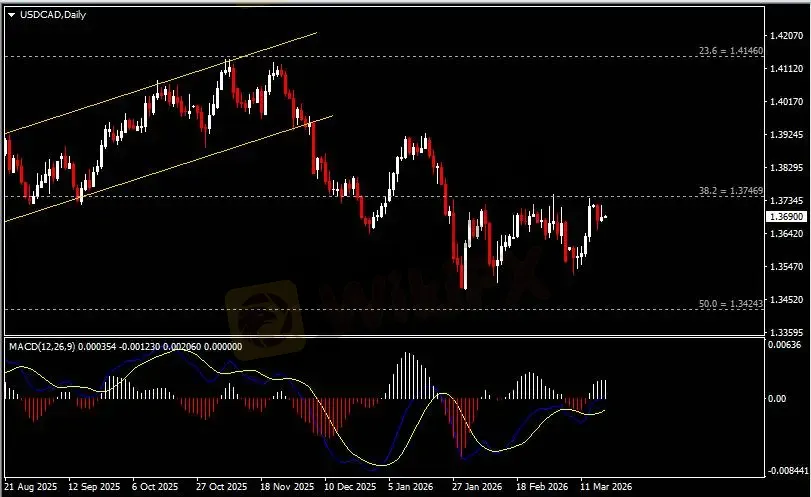 日线图显示美元兑加元回调暂缓,当前仍承压于1.3750阻力。从MACD来看,快慢线向上扩张,白色动能柱温和放量。汇价走势基本和动能柱的变化一致。