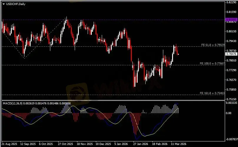 日线图显示美元兑瑞郎回调下挫,当前承压于0.79关键阻力。从MACD来看,快慢线呈拐向,白色动能柱温和收缩。汇价走势基本和动能柱的变化一致。