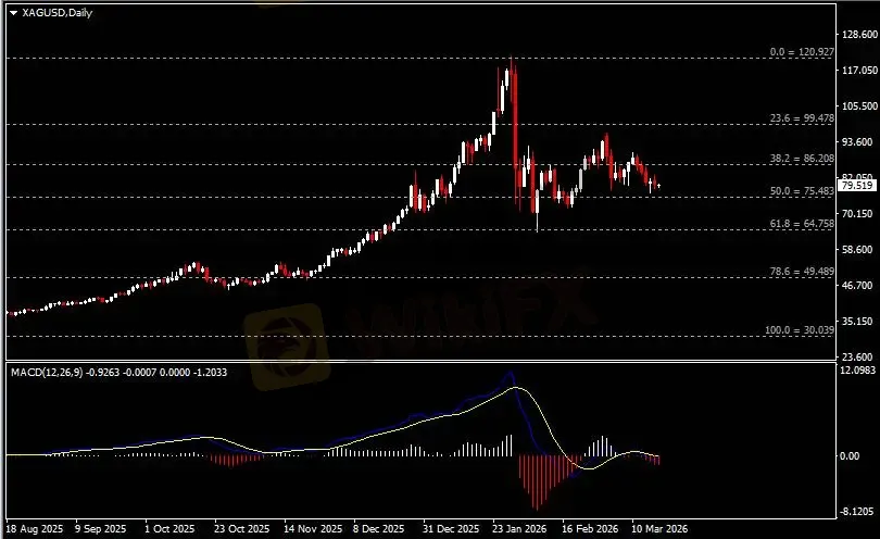 日线图显示银价震荡下跌,当前承压于86.20阻力。从MACD来看,快慢线向下运行,红色动能柱温和放量。银价走势基本和动能柱的变化一致。