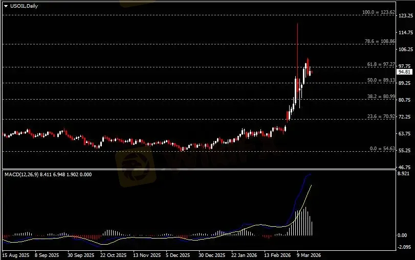 日线图显示油价回调暂缓,当前仍承压于97.30阻力。从MACD来看,快慢线呈拐向,白色动能柱温和收缩。油价走势和动能柱的变化呈分歧。